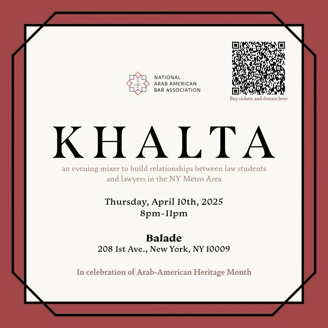 In celebration of Arab-American Heritage Month, join us for KHALTA —a casual, student-led networking mixer bringing together law students and legal professionals of Middle Eastern descent in the New York Metro area.